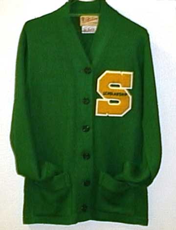 Green scholarship sweater loaned by Gladys Barton McCord.